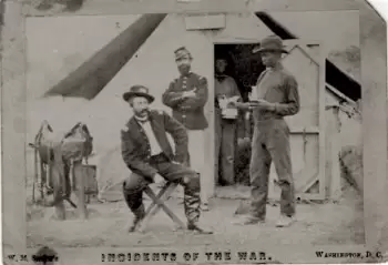 As per Heberton, a photo, which is the highlight of the article, including and identifying Hodge wearing a tam, was taken at a photographer’s camp of the Army of the Potomac in October 1862, shortly after the Battle of Antietam. That photo was taken in Berlin (now Brunswick), Maryland. A handwritten notation on the half-stereo albumen print which identifies him as “Hodges” also identifies Matthew Brady, three other photography assistants and two African Americans, a cook and a teamster. The photo also shows photographic equipment and materials. That image is now housed at the Smithsonian’s National Portrait Gallery. As per Heberton, the Balloon Corps arrived near Antietam four days after that battle. This would place Hodge near the site where Brady was photographed with him, as cited above. Heberton and his assistant searched genealogical information, and confirmed Hodge’s identity through his great-great granddaughter, Edith Smith, who had other photos of her ancestor.