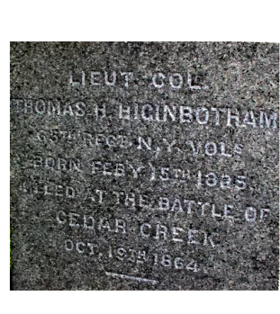 Higginbotham later returned to head his troops and was killed in battle at Cedar Creek, Virginia, on October 19, 1864. Many soldiers from the 65th were injured; there were 90 casualties and 21 dead in this surprise attack against Sheridan’s Army. On November 2, 1864, the New York Daily Herald reported that members of the 65th New York were asked to escort the remains of Thomas H. Higginbotham to his burial site. The men were asked to report to the armory fully uniformed for the procession. On December 15, 1864, his mother, Ann Higinbotham (sic), applied for and received a survivor’s pension, certificate 74,056. The blogger visited Higginbotham’s grave at Green-Wood and noted that a fellow Chasseur, William Willit Tracy (see) is also honored there with a cenotaph. Section 107, lot 15442.