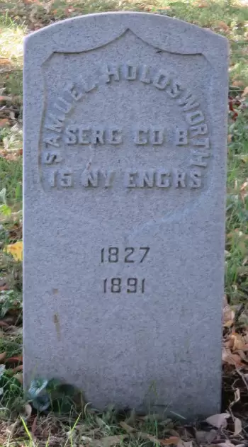 HOLDSWORTH (or OLDSWORTH, HOLDWORTH), SAMUEL (1827-1891). Sergeant, 15th New York Engineers, Company B. Of English birth, he was listed as Samuel Oldsworth in the 1850 census and was living in New York City. During the Civil War, Holdsworth enlisted at New York City as a private on May 9, 1861, and mustered into Company B of the 15th Engineers on June 17. On March 26, 1862, he was promoted to corporal and to sergeant on November 1. The 15th Engineers was at Franklin’s Crossing, Virginia, from April 29-May 2, 1863; the unit had previously built a bridge at Fredericksburg across the Rappahannock River on December 11, 1862, just prior to the battle there. He was discharged from military service on June 25, 1863.
