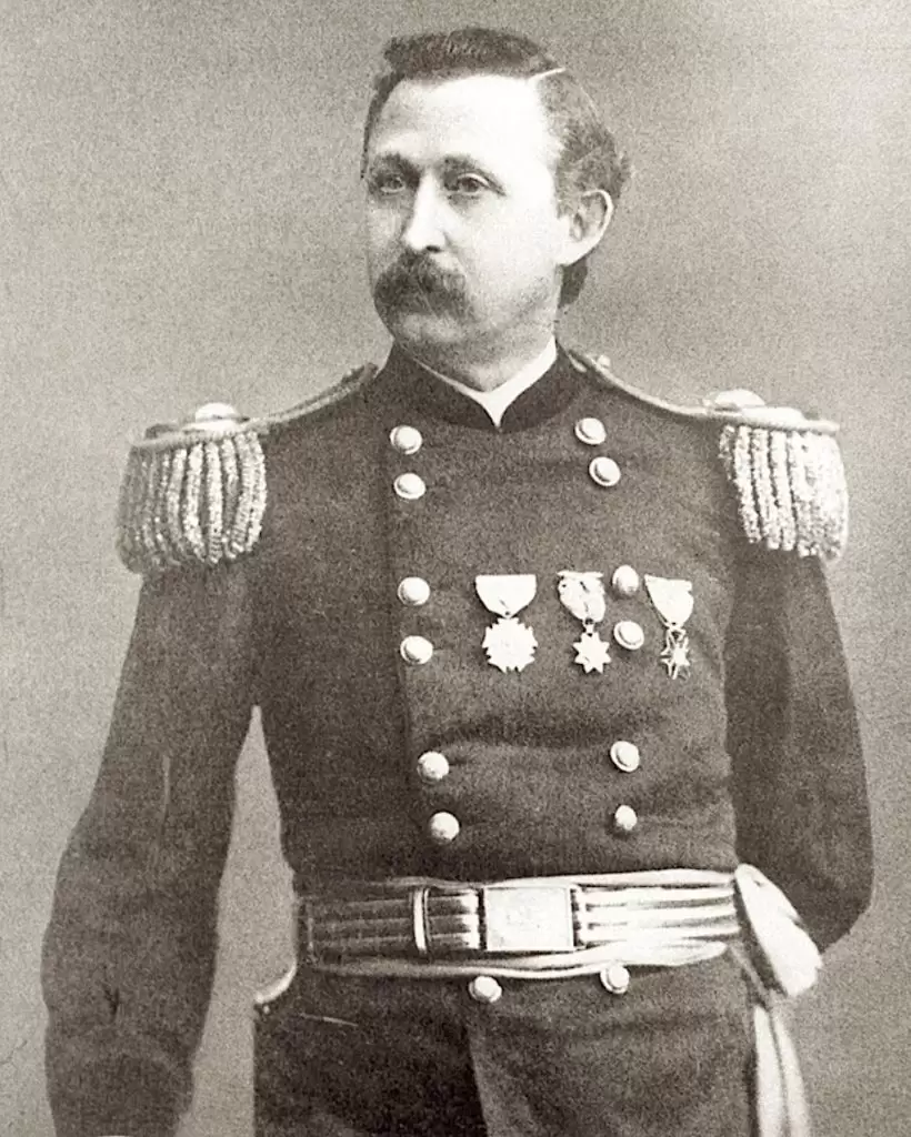 When the Civil War broke out, Kintzing was present at the destruction of the Naval Yard in Norfolk, Virginia, served on board the steamship Roanoke in the Atlantic Blockading Squadron in 1861, and participated in engagements with the Merrimac and at the Sewall’s Point Batteries, Virginia. In 1862, he went to Philadelphia for recruiting service. During his assignment to establish marine barracks at Cairo, Illinois, from 1863-64, he was commissioned lieutenant colonel on June 10, 1864. Kintzing was then assigned to the barracks in Philadelphia and the Mare Island Navy Yard in San Francisco. He was commissioned colonel on December 7, 1867, when he served in Philadelphia, a term lasting until 1877. Subsequent service was at the Brooklyn Navy Yard and a short stint at Norfolk prior to retirement. He last lived at 215 Park Place in Brooklyn, his wife being from a family with longtime roots there. Cirrhosis of the liver caused his death. Section 173, lot 21516, grave 1.