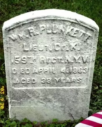 PLUNKETT, WILLIAM R. (1825-1863). First lieutenant, 159th New York Infantry, Company K; private, 13th Regiment, New York State Militia, Company C. On April 23, 1861, Plunkett enrolled as a private at Brooklyn, mustered into the 13th Regiment on May 17, and mustered out with his company on August 6, 1861, at Brooklyn. After re-enlisting as a second lieutenant at Brooklyn on September 18, 1862, he was commissioned into the 159th New York nine days later, and promoted to first lieutenant on November 3, 1862. He received a gunshot wound to the head, just above his eye at Irish Bend, Louisiana, on April 14, 1863, and succumbed to his wounds three days later at the hospital in Brashear City, Louisiana.
