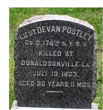 POSTLEY (or POSTLY), DE VAN (1842-1863). Second lieutenant, 174th New York, Company D; private, 7th Regiment, New York State Militia, Company B. Postley was born in New York City and enrolled there on April 17, 1861, to serve for 30 days in the 7th Regiment under the command of Colonel Marshall Lefferts (see). He mustered in on April 26, and accidentally shot himself with his own pistol during the march to Washington, D.C. His company mustered out on June 3 at New York City. Returning to the same regiment and company for three months in 1862, now part of the New York State National Guard, he enrolled on April 25 at New York City, mustered in as a private on June 19, and mustered out with his company at New York City on September 5. A month later, he re-enlisted at New York City as a second lieutenant on October 20, and was immediately commissioned into the 174th New York. The 174th, nicknamed the 5th Metropolitan Guard, saw action in the Gulf region, first at Port Hudson, Louisiana. Postley was killed in combat on July 13, 1863, when his flank retreated without cover at Donaldsonville, Louisiana, during the Battle of Cox’s Plantation, a humiliating defeat for the Union which outnumbered their opponents by more than three to one. Postley was the only officer of the 174th killed in that engagement. He was interred at Green-Wood on March 7, 1864; his funeral attended by members of his company from the 7th Regiment. He was the nephew of Washington Postley (see). Section 60, lot 2588.