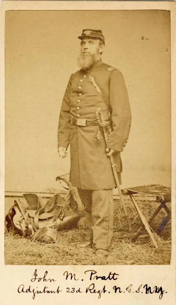 PRATT, JOHN M. (1842-1929). Adjutant, 23rd Regiment, New York State National Guard. Of Irish birth, he enlisted on June 18, 1863, at Brooklyn, was commissioned into the Field and Staff of the 23rd New York that day, and mustered out at Brooklyn after 30 days on July 22. He last lived at the Soldiers’ Home in Kearny, New Jersey. His death was attributed to paralysis caused by a cerebral hemorrhage. Section 136, lot 28307, grave 13.