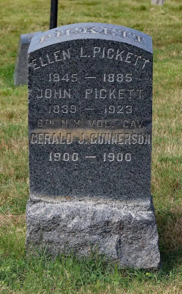 In 1867, Pickett married Ellen Lunderkin. At the time of the 1870 census, he and his wife and two young children were living in Washington, D.C., where he was a printer for the United States Treasury. By the time of the 1880 census, he was living in Brooklyn with his wife, three children and his mother; he was recorded as living in Brooklyn in 1892, 1900 and 1905. A widower in 1910, he lived with his daughter, Lillian, and her family in Sharon, Massachusetts. In 1920, he lived with his daughter, Sarah, and her family in Milford, Pennsylvania. His last residence was 131 1st Street in Woodhaven, Queens. His death was attributed to arteriosclerosis. Section 85, lot 1594, grave 238.