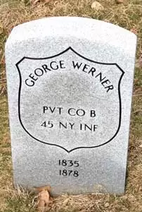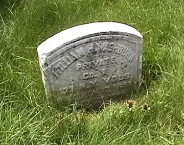 WASHBURN, GEORGE W. (1835-1901). Private, 83rd New York Infantry, Company G. Born in New York, he enlisted and mustered into the 83rd at New York City on May 27, 1861. He was wounded at Fredericksburg, Virginia, on December 13, 1862, and mustered out after serving three years on June 23, 1864, at New York City. He was likely the brother of Daniel Washburn (see). He last lived at 22 West 16th Street in Manhattan. Washburn died of heart disease. Section 43, lot 338.