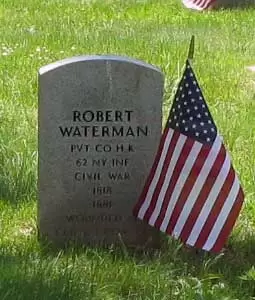 WATERMAN, ROBERT (1818-1881). Private, 62nd New York Infantry, Companies H and K. Born in New York City, he enlisted there on July 5, 1861, and mustered into Company H of the 62nd New York on August 15. On February 5, 1864, he re-enlisted and mustered into Company K of the same regiment. Waterman was severely wounded in action on October 19, 1864, at Cedar Creek, Virginia, necessitating the amputation of his right arm. He was discharged for wounds on July 27, 1865. His last residence was 130 Rail Road Avenue, Jersey City, New Jersey. He died of cancer. Section 170, lot 12732.