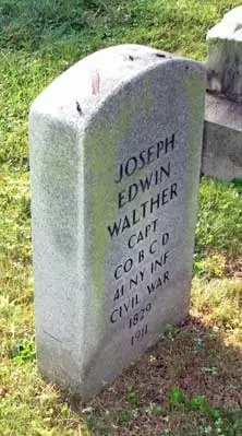 WALTHER (or WALTER), JOSEPH EDWIN (1829-1911). Captain, 41st New York Infantry, Companies C, B, and D. At age 32, Massachusetts-born Walther enlisted at New York City as a sergeant, and mustered into Company C of the 41st New York on June 6, 1861. He rose to the rank of second lieutenant on August 30, 1862, and was transferred two days later to Company B. On February 13, 1863, he became a first lieutenant and on March 1 of that year was transferred back to Company C. After he was wounded at the Battle of Gettysburg, Pennsylvania, he was subsequently transferred to Company D on November 1, 1863, promoted to captain on November 20, 1863, and discharged for disability on March 21, 1864. In 1864, his application for an invalid pension was granted, certificate 82,265. His last residence was in Elizabeth, New Jersey. His death was caused by pericarditis. Section 66, lot 3281.