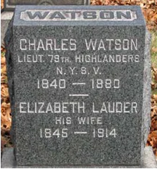 WATSON, CHARLES (1840-1880). First lieutenant, 79th New York Infantry, Companies C and I. Originally from Scotland, Watson enlisted as a corporal at New York City on July 13, 1861, and mustered into Company C of the 79th New York, known familiarly as the Highlanders, two weeks later. He was promoted to sergeant of his company at some point before he was commissioned into Company I of the same regiment as a second lieutenant on January 13, 1863. Watson returned to Company C as a first lieutenant on February 24. On November 25, 1863, he was wounded in action at Knoxville, Tennessee, and was discharged on May 31, 1864, at New York City. His last residence was 85 7th Street in New York City. In 1880, Elizabeth Watson’s application for a widow’s pension was granted, certificate 233,367. Section 1, lot 15214.