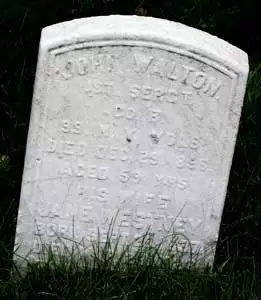 WALTON, JOHN (1838-1896). Sergeant, 99th New York Infantry, Companies K, C, and B. Walton enlisted and mustered into Company K on January 30, 1862, at Boston, Massachusetts, as a private. He was promoted to corporal, then sergeant on August 1, 1863, served as a sergeant in Company C, and was transferred to Company B on September 20, 1864. He was discharged on January 28, 1865, at New Berne, North Carolina. Walton’s death was caused by mitral regurgitation. Section 135, lot 14964, grave 711.