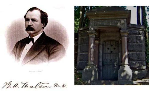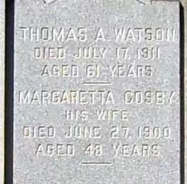 However, Watson’s career and reputation were marred by controversy. According to articles in the Buffalo Courier and the Brooklyn Daily Eagle on June 5, 1886, he was arraigned and charged with cruelty to animals. When the second floor of his Jersey City carriage house was searched, there was a pen holding six dogs. Carcasses of dogs and dissected dog spines were also on display. He apparently experimented on the animals from February 9 through May 31, 1886, using cruel methods that subjected the dogs to spinal contusions by dropping them 30 feet from a harness while under anesthesia; dogs that did not recover were not fed. The story in the Brooklyn Daily Eagle stated that 41 dogs, all numbered, were subjects of the experiments and that the paperwork was obtained by the New Jersey Society for the Prevention of Cruelty to Animals. Watson was charged with 31 civil suits each carrying a $100 fine. His coachman was also placed under arrest as a witness. Watson, an expert surgeon in the employ of the Pennsylvania Railroad Company, claimed that the experiments were necessary to parallel the effects of spine injuries on humans who sued the railroad claiming that they lost vitality months after their injuries. Some of the animals suffered broken legs, torn arteries, and ruptured organs; criminal charges were being considered. His last residence was in Jersey City, New Jersey. He was survived by his wife and a daughter; his son died at age eight in 1890. In 1910, Phebe Ann Traphagen Watson, who is interred with him and whom he married in 1868, applied for and received a widow’s pension, certificate 737,806. He died of diabetes. Section 119, lot 27084.