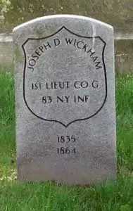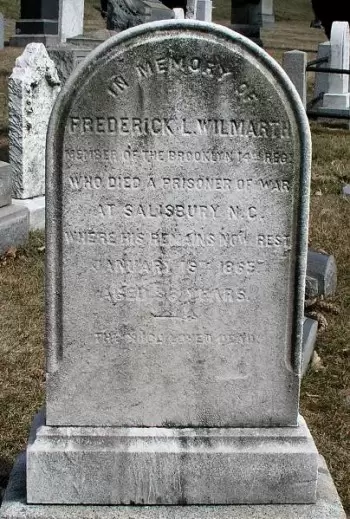 WILMARTH, FREDERICK L. (or D.) (1828-1865). Private, 84th New York (14th Brooklyn) Infantry; 5th New York Veteran Infantry, Company I. Wilmarth is not buried at Green-Wood; a cenotaph honors his memory and service. He enlisted and mustered into the 14th on February 16, 1864, at Brooklyn, and transferred to the 5th New York Veterans on June 2, 1864. The cenotaph reads, “In memory of Frederick L. Wilmarth, member of the Brooklyn 14th Reg. who died a prisoner of war at Salisbury, N.C., where his remains now rest. January 18, 1865. Aged 36 years.” Section 106, lot 10731.