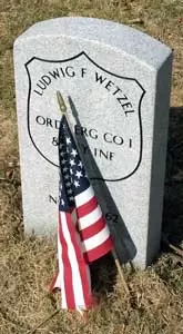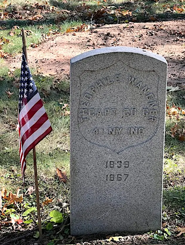 WANGNER, THEOPHILE (1839-1867). Captain, 41st New York Infantry, Companies K and G. Of German origin, Wangner enlisted at New York City as a private on June 6, 1861, the same day that he mustered into Company K of the 41st New York. On August 10, 1861, he was promoted to sergeant of his company and became sergeant major on March 7, 1862, when he was transferred to 41st’s Field and Staff. When he was promoted to second lieutenant on September 29, 1862, he returned to Company K. On January 1, 1863, he was promoted to adjutant and remained with his company. On January 29, 1864, he was promoted to captain, and transferred to Company G. He was discharged on May 9, 1864, at New York City. On October 19, 1864, he became a naturalized citizen and was employed as a clerk. His last residence was 357 8th Avenue in Manhattan. Section 121, lot 11189, grave 131.