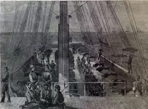 At length the roll of drums is heard in the distance, and afar off we can see the glitter of bayonets as they flash in the rays of the setting sun. The police become suddenly active, and push the expectant people back; then the crowd parts, and the head of the column appears. It is the gallant New-York Seventh, stripped of all gaudy decoration, but well-equipped for active service. With full ranks, the knapsacks giving the command and appearance of solidity not observable on holiday parade, the regiment marches steadily forward to the monotonous beat of the drums. Men in the ranks are recognized by friends in the throng, and earnest farewells are uttered.