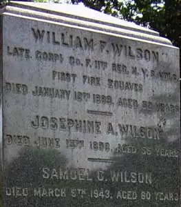 WILSON, WILLIAM F. (1837-1889). Corporal, 11th New York Infantry, Company F. A native of New York City, Wilson enlisted there as a corporal on April 20, 1861, and mustered into the 11th New York on May 7. On July 21, 1861, he was taken prisoner of war at the Battle of Bull Run, Virginia. He was confined at Richmond, Virginia, on July 23, 1861, and paroled. He mustered out on June 2, 1862, at New York City. On September 5, 1862, he applied for an invalid pension that was granted, certificate 113,025. He last lived on Third Avenue in Manhattan. His widow received a pension after his death, certificate 288,637. Section 109, lot 9440.