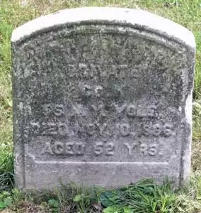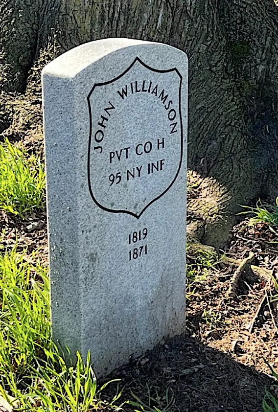 WILLIAMSON, JOHN W. (1819-1871). Private, 95th New York Infantry, Companies H and F. Of Irish origin, he enlisted on October 12, 1861, at New York City, as a private. After mustering into Company H of the 95th New York on November 1, 1861, he was transferred into Company F on January 25, 1864, returned to Company H on April 15, 1864, and was discharged on October 12 of that same year. He last lived in New York. Section 17, lot 17245, grave 40.