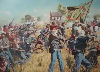 “…Stumbling along in open column, we pushed on through the darkness silently but eagerly, until, after a two-hours’ march, we were led into a bit of woods on the right of the road, and ordered to lie down. As we did so, I began wondering what the result of the approaching engagement would be. Here I lay, musket in hand, among men of whose existence I had been ignorant a few short weeks before; and, as I stretched my tired body on the soft and fragrant earth, I realized the grim earnestness of the situation. In a few hours I might be among the dead, lying motionless on the battle-field, or groaning in an ambulance, sick with pain and loss of blood. Yet a strange feeling of content rested upon me; and, though we were all nervous over the suspense, I noticed no symptoms of cowardice. Few of us spoke, even in whispers, for silence had been strictly enjoined; and the absence of all sound among so many men was to me more painful to bear than any actual fighting could possibly be…”