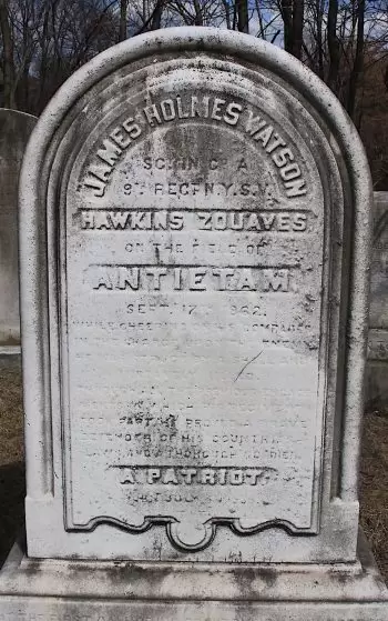 WATSON, JAMES HOLMES (or HOLMS) (1838-1862). Sergeant, 9th New York Infantry, Company A; unknown rank, 71st New York State Militia. Watson was born in New York City. As per an inscription on his gravestone, “at the first call of his country he enlisted in the 71st Regt. and was in the battle of Bull Run.” Apparently, after that service, Watson re-enlisted as a private at New York City on September 2, 1861, mustered directly into the 9th New York, was promoted to corporal on October 14, 1861, and rose to sergeant on January 19, 1862. He was killed in action on September 17, 1862, at the Battle of Antietam, Maryland, and originally buried at its National Cemetery, gravesite 747.