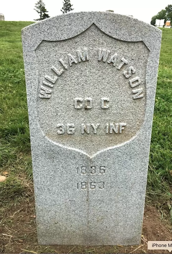 WATSON, WILLIAM (1836-1863). Private, 36th New York Infantry, Company C. Watson was born in New York. After enlisting as a private at New York City on May 15, 1861, he mustered into the 36th New York on June 17. According to his muster roll, he was present with his company in April 1863 after returning from desertion on March 21 of that year; his muster roll indicates that he was paid through February 28, 1863, and that he served in the 10th Regiment after he returned from desertion. Watson mustered out with his company on July 15, 1863, at New York City. As per his obituary in the New York Herald on August 5, 1863, he died suddenly; friends and relatives and members of the 36th Regiment were invited to attend his funeral at the home of his brother-in-law at 143 East 20th Street in New York City. The cause of his death was “coup de soleil” (sunstroke). Lot 4071, grave 440.