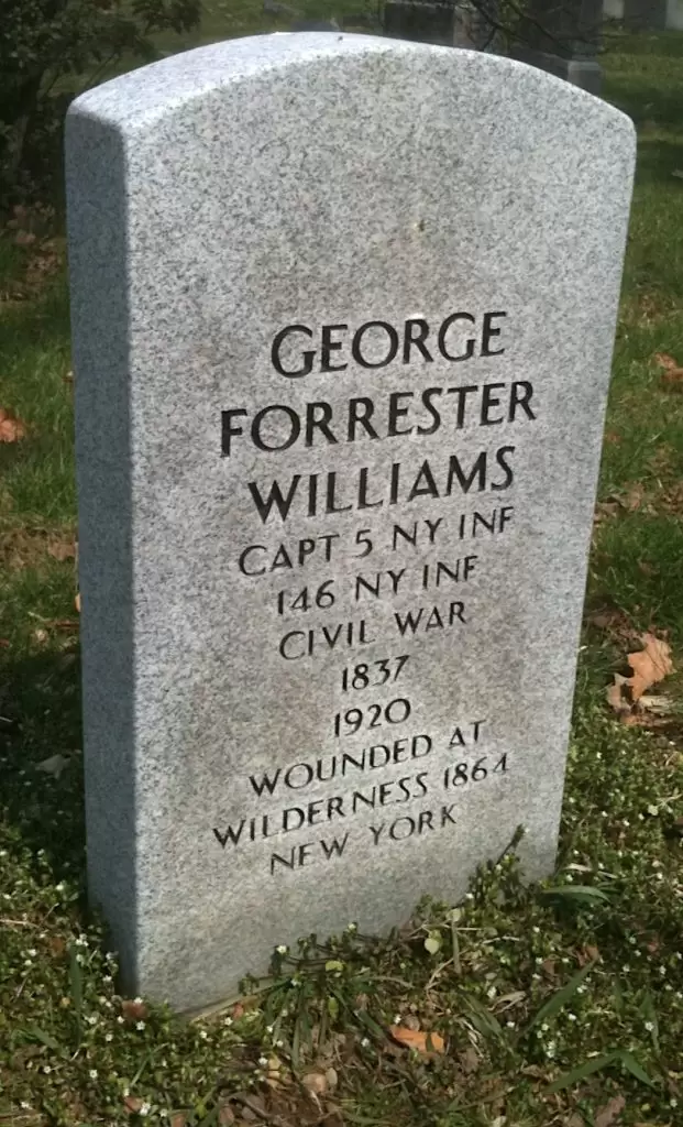During the Civil War, he enlisted as a private on August 8, 1862, and mustered immediately into Company D of the 5th New York Infantry. As per his muster roll, he was a hatter who was 5′ 7″ tall with blue eyes, light hair and a light complexion. He was transferred to Company I of the 146th New York on May 4, 1863, and promoted to corporal on an unknown date. On May 5, 1864, he was wounded by shell fragments in the left leg below the knee and captured at the Battle of the Wilderness, Virginia. Williams was then confined at Andersonville and Florence Prisons before he was paroled at Savannah, Georgia, on November 30, 1864. After being treated at a hospital at Annapolis, Maryland, he returned to duty on May 8, 1865, and mustered out near Alexandria, Virginia, on June 3, 1865.