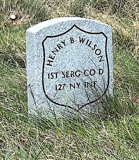 WILSON, HENRY B. (1824-1876). First sergeant, 127th New York Infantry, Company D. Born in Denmark, he enlisted on July 24, 1862, at New York City, as a sergeant. On September 8, he mustered into the 127th New York, was promoted to first sergeant of his company on January 21, 1865, and mustered out on June 30, 1865, at Charleston, South Carolina. His last residence was in New York City. Section 115, lot 4196, grave 360.
