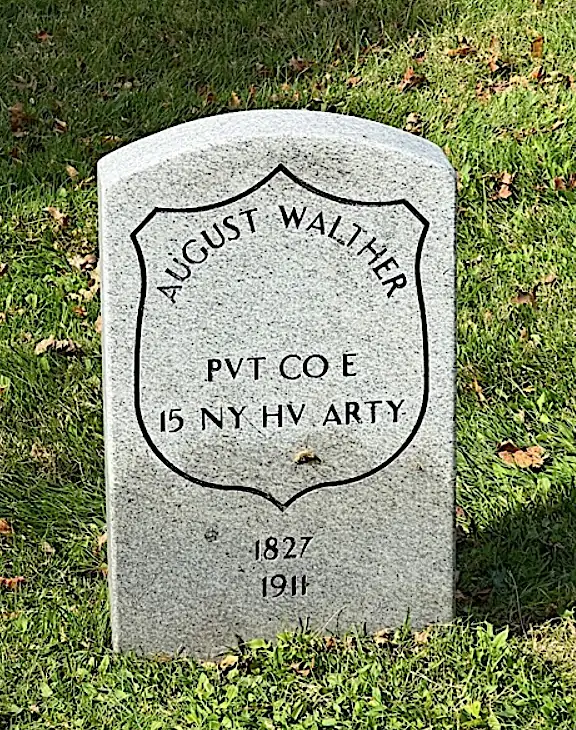 WALTHER, AUGUST (1832-1911). Private, 15th New York Heavy Artillery, Company E. Originally from Frankfort, Germany, he immigrated to the United States in 1850. During the Civil War, Walther enlisted at New York City as a private on January 22, 1864, mustered immediately into the 15th Heavy Artillery, and mustered out on August 22, 1865, at Washington, D.C. As per his obituary in the Brooklyn Daily Eagle, he was a produce broker who retired from the New York Produce Exchange in 1891. He last resided at 539 Washington Avenue in Brooklyn where he lived for more than forty years. Section 113, lot 10720, grave 5.