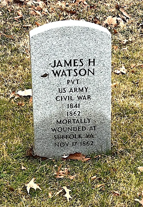 WATSON, JAMES H. (1841-1862). Unknown soldier history. Watson died on November 17, 1862, of wounds received in battle at Suffolk, Virginia. Details of his service are unknown. Section 200, lot 25260.