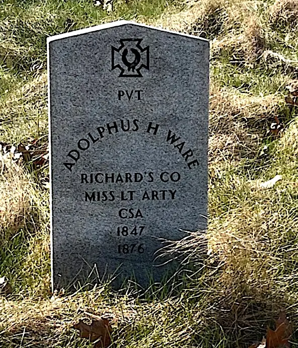 WARE, ADOLPHUS H. (1847-1876). Private, Captain Richards’ Company, Mississippi Light Artillery (Madison Light Artillery), Company A, Confederate States of America. A student, age 16, and resident of Sharon, Mississippi, Ware enlisted as a private on May 23, 1863, for a period of three years at Canton, Mississippi. A Mississippi native, he mustered into Company A, Captain Richards’ Company, Mississippi Light Artillery (Madison Light Artillery), serving the duration of the War, and taking part in the Battle of Bristoe Station, Virginia, on October 14, 1863.