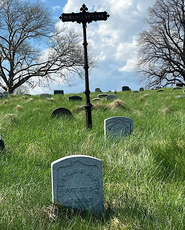 WARNER, CHRISTIAN H. (1827-1869). Private, 49th New York Infantry, Company D. A New York native, Warner enlisted as a private at Buffalo, New York, on August 22, 1861, and mustered into the 49th New York six days later. Subsequently, he was transferred to the gunboat Mound City in the Mississippi River in 1862 or 1863. He last lived in Jersey City, New Jersey. Section 122, lot 17806, grave 30.