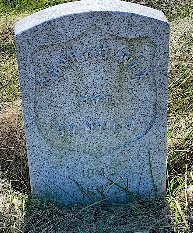 WILSON, CONRAD (1848-1913). Corporal, 22nd New York Cavalry, Companies I and M. Originally from Norway, Wilson enlisted on January 15, 1864, as a private, at Rochester, New York. On February 2, he mustered into Company I of the 22nd New York Cavalry and was promoted to corporal on March 15 effective upon his transfer that day to Company M. He mustered out on May 28, 1865, at Winchester, Virginia. His application for an invalid pension was granted in 1899, certificate 1,145,383. Wilson’s last residence was 77 West 89th Street in Manhattan. Nickoline Wilson, who is interred with him, applied for and received a widow’s pension in 1913, certificate 756,928. Section 123, lot 134495, grave 2.