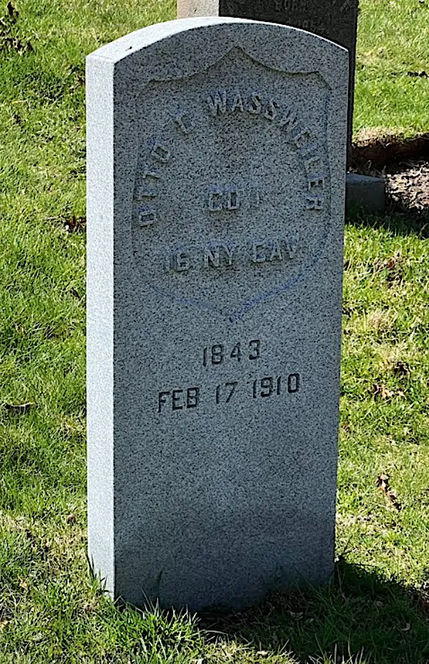 WASSWEILER, OTTO FERDINAND CHRISTIAN (1843-1910). Private, 16th New York Cavalry, Company I; 3rd New York Provisional Cavalry, Company E. Wassweiler was born in St. Johann in Saarbrucken, Germany. He immigrated to the United States in 1852, as per the 1900 census. During the Civil War, he enlisted as a private at New York City on November 22, 1864, and mustered immediately into Company I of the 16th New York Cavalry. After the assassination of President Abraham Lincoln, a detachment of the 16th New York was involved in searching for the assassins; others were detached to Lincoln Barracks at Lafayette Park, across from the White House. The 16th Cavalry escorted the slain President’s funeral procession in Washington, D.C., on April 17, the largest mounted unit in the convoy. On May 23, 1865, the 16th Cavalry and the 2nd Massachusetts participated in the Grand Review of Armies in the nation’s capital; the 16th had a place of honor for capturing John Wilkes Booth, Lincoln’s assassin. On August 17, 1865, Wassweiler transferred into Company E of the 3rd New York Provisional Cavalry before he mustered out the next month on September 21, 1865, at Camp Barry in Washington, D.C.