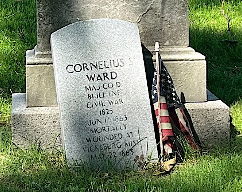 WARD, CORNELIUS S. (1825-1863). Major, 81st Illinois Infantry, Company D. A native of New York State and a resident of Murphysboro, Illinois, he enlisted as a captain on August 12, 1862, and was commissioned into Company D of the 81st Illinois on August 26. He re-enlisted in the 81st as major on May 22, 1863, and was commissioned that day. After he was wounded in battle at an unspecified place and time (it may have been the first general assault on Vicksburg, Mississippi), Ward died of wounds on June 17, 1863, and was interred at Green-Wood seven days later. Section 83, lot 1134.