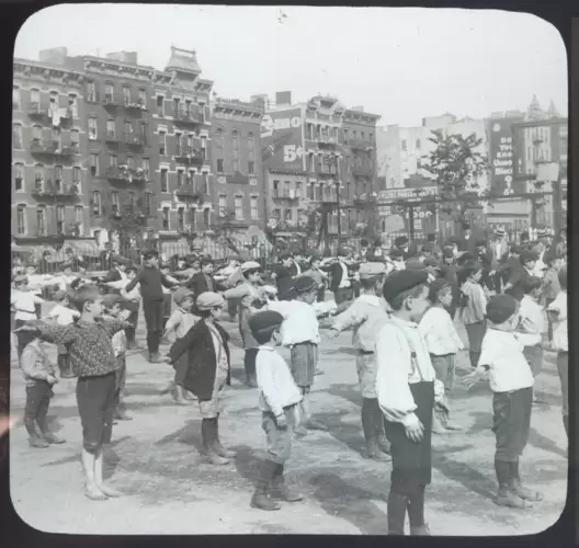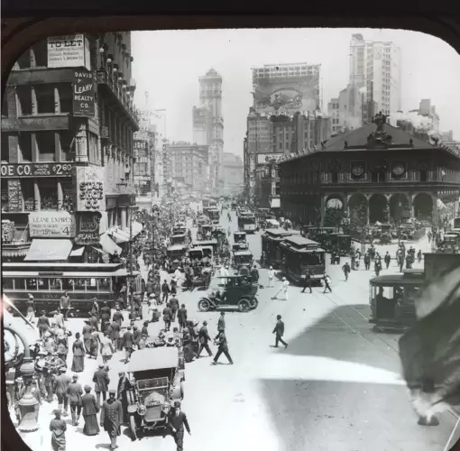 In this collection, the viewer encounters buildings, transportation street signs and businesses that have either miraculously survived the passage of time or have long ago faded into the past. We see faces and neighborhoods that look familiar and experience both a shock of recognition and a sense of disquiet—the view is somehow the same, yet everything has changed. We know this place, this city—it is all around us—and yet the lively world we are looking at and the faces that return our gaze through this small square of glass, seemingly so full of life, no longer exist. The lantern slide offers a unique glimpse into this vanished world.
