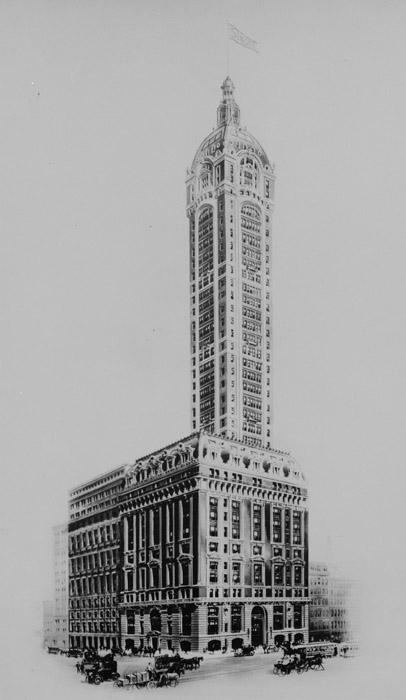 It turned out that Richard is the Director of Historic Services for Suffolk County Parks. Richard planned to come along on the Bayport trip to Green-Wood, and he had a few ideas about some stops to include in the tour. First of all, Richard showed me a photograph of one of the most spectacular tombs at Green-Wood. He asked me if I knew where it was; I did, but that was all I knew about it. We drove over and took a look. Richard told me Frederick Bourne (1851-1919), whose last name appeared above the door, had been president of the Singer Sewing Machine Company. Well, that was fascinating! I went home and that night determined to find out more about Frederick Bourne. It turns out he was a real success story–working his way up in the company until he was in charge. Bourne became a man of tremendous wealth–he had an estate built in Oakdale, on Long Island, Indian Neck Hall, that was designed by architect Ernest Flagg and completed in 1900. Ultimately, this estate stretched across almost 2,000 acres. Today the estate is home to the Charles R. Dominy County Park , Suffolk County Golf Course and the Long Island Maritime Museum . And, it turned out, that was not Bourne’s only connection with Flagg. Bourne had another estate upstate, in the Thousand Islands area of the St. Lawrence River. He owned an island there on which he had Dark Island, at a cost of half a million dollars (when that was real money) built by none other than architect Ernest Flagg. And, it turns out, one of the most spectacular skyscrapers ever built was designed by Flagg for Bourne: the Singer Building (torn down in 1967, one of the most horrendous of demolition atrocities ever in Manhattan). The Singer Building, now sadly destroyed, but in its time one of New York’s great skyscrapers.