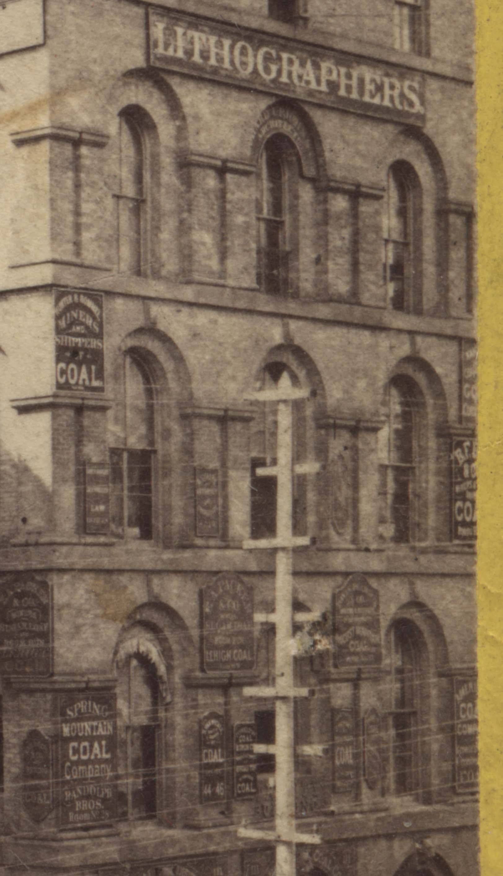 Update: I was able to scan a close-up of the window to Richard Upjohn’s office at the highest resolution possible on the scanner at the cemetery–2400 dpi. Hopefully you can see the sign in this image. It is the center window, directly under the LITHOGRAPHER sign–it says, I believe, Richard Upjohn & Son/Architects in the circular area at the top of the window. How many hours did Upjohn spend looking east, out that window, towards Brooklyn, and thinking about the magnificent brownstone gates that he had designed for Green-Wood Cemetery’s main entrance?