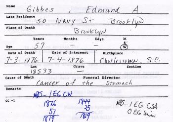 A few days ago I was working on these forms. I went through about 100 with no matches. Then I came across the form above. What immediately caught my eye was his listed place of birth: Charlestown (sic), S(outh) C(arolina). That looked intriguing we’ve already found about 70 Confederates at Green-Wood. Perhaps we had another one here? So, I put Gibbes, Edmund, into a database and up popped the information that a man named Edmund A. Gibbes has served on the medical staff of the Confederate forces. That looked very good. Middle initials are important and here was a match of first name, middle initial, and last names. Further, the database told me that, of the 6 million men who served in the Civil War, for North and South, there had been only one named Edmund Gibbes. We might be on to something here!