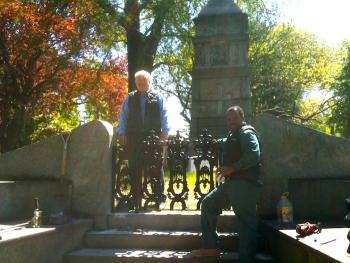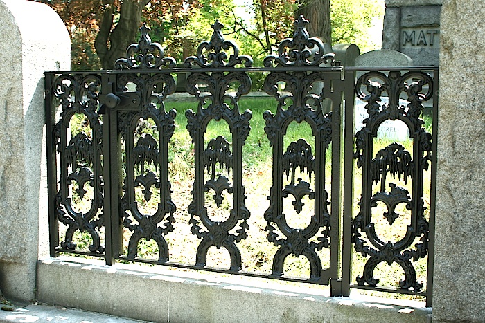 I was cruising around the cemetery yesterday, leading a tour on our trolley, when we came across this scene. There were Domenick Lanzi, our master ironworker, and his assistant, Vincent Joseph, installing my cast iron gate. Now, it really isn’t mine, at least not anymore. I bought it about five years ago at an antiques show in Connecticut because I recognized the pattern–it’s a weeping willow, with sheep lying beneath it. This was a popular motif for cast iron cemetery fences a century and a half ago: the weeping willow associated with mourning, the resting sheep with a peaceful death. The casting, labelled as that of a Hartford, Connecticut foundry, is very heavy–I had to recruit a kindly neighbor to help me carry it into my house. And there it remained for a few years, directly in front of my fireplace. I liked it there, but one day it occurred to me that, if I ever wanted to use my fireplace again, the gate had to go somewhere else. So I spoke with Art Presson, our superintendent of the grounds, and asked if he was interested. The idea was to put a good cast iron gate back into Green-Wood; there were many of these in the 19th century, but unfortunately the cemetery removed almost all of them, the good and the bad. Well, Art was interested. He bought two more iron sections of this pattern, to fill the entire opening, and the gate was installed yesterday at the corner of Hemlock and Battle Avenues, opposite the Elias Howe bust.
