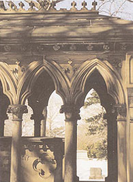 The Pierrepont monument is basically in whole and sound condition. A number of vulnerable ornamental elements such as Gothic finials (seven of eight) on the engaged gables of the buttresses and one fleur-de-lis from the roof cresting have been lost. There is some limited scaling of brownstone surfaces. The damp, shaded environment of the pavilion and particularly its interior, has resulted in the formation of blackened crusts on some surfaces, efflorescence, and various biological growths including wasp nests. A considerable percentage of pointing is missing, much of it being on the exposed roof stones. This condition has permitted water penetration affecting the interior ceiling and other surfaces. Some evidence of early stone patching and repointing exists in areas of the masonry.