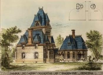 The above drawing appeared in the American Architect and Building News of August 3, 1878. This wonderful print, in our Historic Fund Collections, shows both of these buildings; the residence is in the foreground, the Visitors’ Lounge in the background.