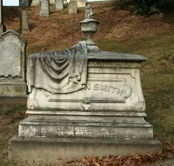 This monument to Washington Smith is very interesting. The inscription on the monument states that Smith died in 1863; the monument probably dates from shortly after his death. And a very special monument it is. The sculptor wanted you to see a drapery, the shroud that remains behind after resurrection, but not just any old thing. Instead, the monument is carved in such a way to cover up parts of Washington Smith’s name–parts of his first name are under the drapery on the front of the monument and parts of his last name are behind the carved fabric on the back. Really quite a wonderful design.