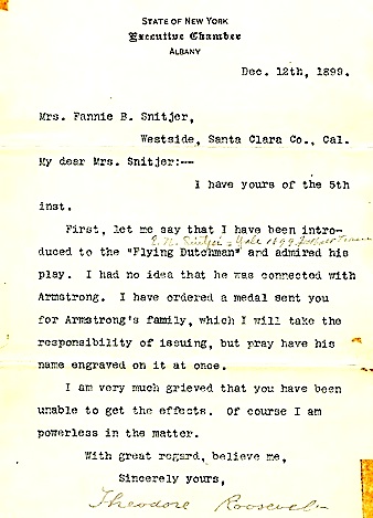 Roosevelt, as president, visited San Jose, California, in 1903. Armstrong’s mother-in-law had tried to arrange, through San Jose’s mayor, for Armstrong’s daughter to visit with the president. However, the mayor had decided that it was not possible to arrange such a visit. So, Bonney Armstrong, the young girl, has stood along the president’s route, wearing the Rough Rider medal Roosevelt himself had sent her, and holding a basket of flowers. As Roosevelt was driven past her, he spotted the medal and ordered that his carriage be stopped. Roosevelt visited with the girl and took the basket of flowers she offered him. Soon thereafter, on May 19, 1903, a letter was sent to Bonney by Roosevelt’s secretary, William Loeb, expressing the president’s “cordial thanks” for “the beautiful flowers which you were so kind as to send him.”