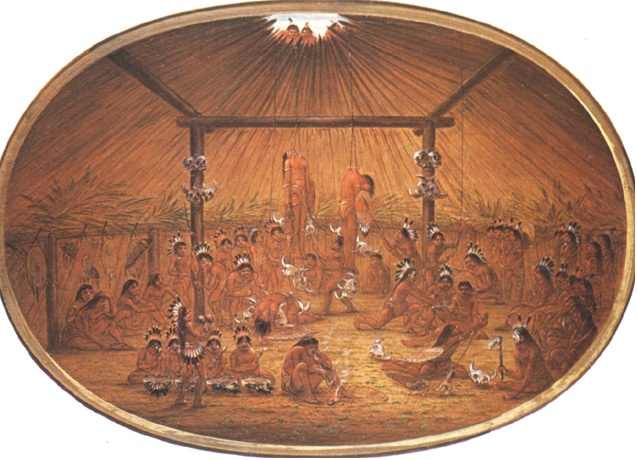 And here is Catlin’s painting of the Mandan’s Okipa ceremony, a test for males involving pain, endurance, and sacrifice, which was central to their rituals: