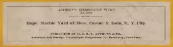 This view dates from the 1860s; this sort of stereoview, with a yellow cardboard mount, was not published until the 1860s. And, if I recall correctly, the Anthonys moved uptown from the address on the label, 501 Broadway, late in the 1860s.