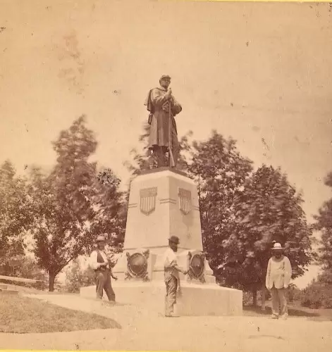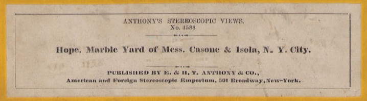 And further research establishes that Casoni & Isola were the fabricators of the famed Seventh Regiment Memorial in Central Park. The monument was designed by sculptor John Quincy Adams War in 1869, the architect Richard Morris Hunt worked on the design of the base, and Casoni & Isola executed the carving. Quite the team of artists! This half-stereoview records the final touches being placed on the Seventh’s monument in 1870.