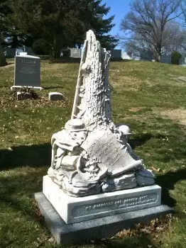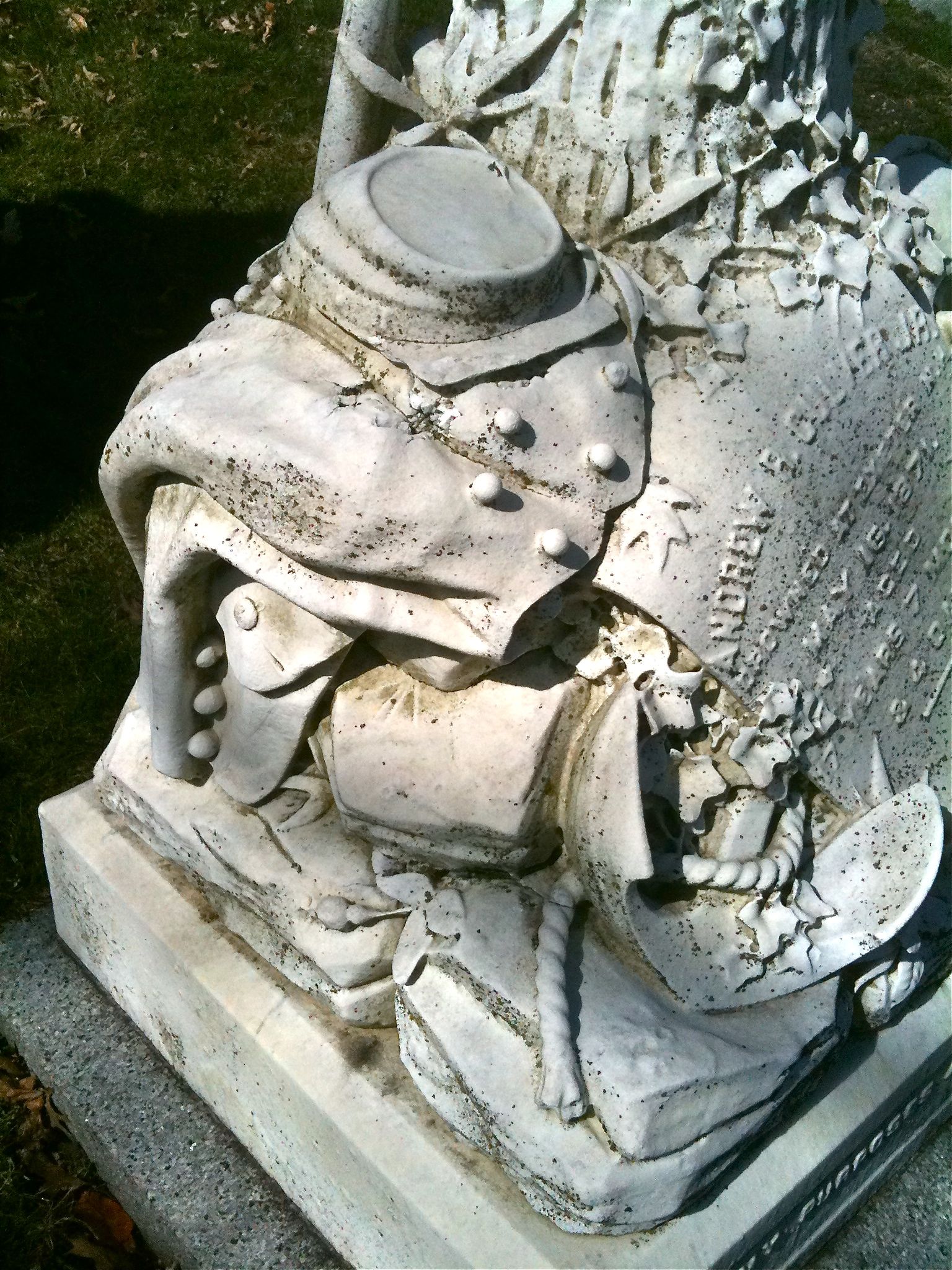 The detailing is exquisite–the musket in the back (carefully attached in several places to prevent its being broken loose from the rest of the monument), the pile of books on the right (not just neatly stacked, but moving back and forth; they were being used to learn, not just an untouched pile of books), the globe, the anchor of hope, the rope tucked underneath the plaque that contains the inscription, the buttons on the uniform, the bark on the tree. This monument is rich with symbolism: the globe and books as exploration and learning, the musket and uniform of a warrior, the anchor of hope, and the broken tree (symbolizing a young life that had been cut short before reaching its full maturity).