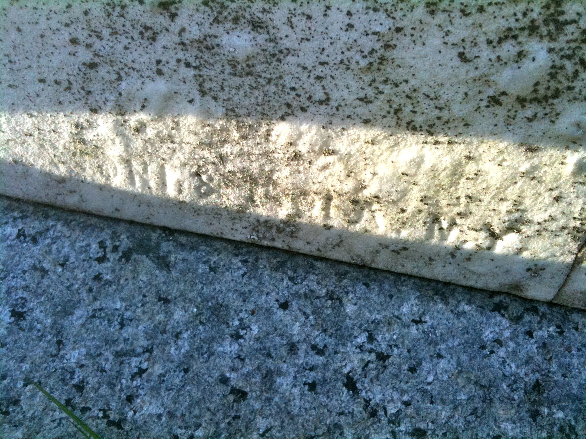 It was readily apparent that this monument had been carved by a very gifted monument maker. So, I started circling it, look for a signature, a mark of pride, that might have been placed somewhere. And, lo and behold, it looked to me like there might be some lettering along the base on the right side. But the sun wasn’t helping–that entire side was in shadow.