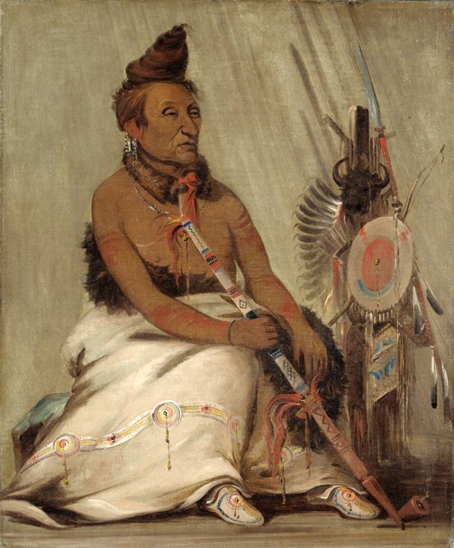 Here is George Catlin’s painting of Black Moccasin, who met the explorers Lewis and Clark in 1804, was given a Peace Medal by them, and asked Catlin, when he met him in 1832, to “carry his regards to Clark in St. Louis.”