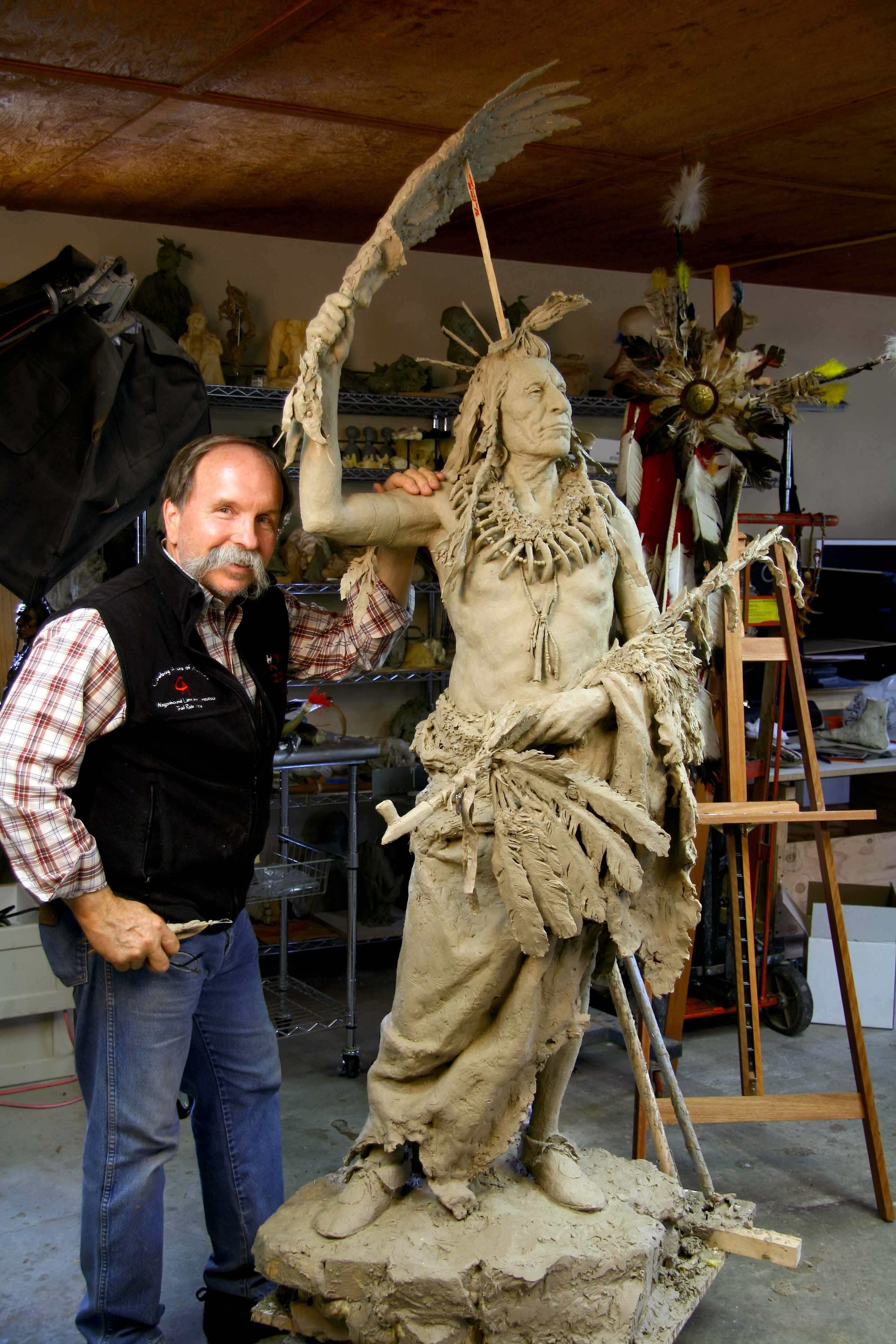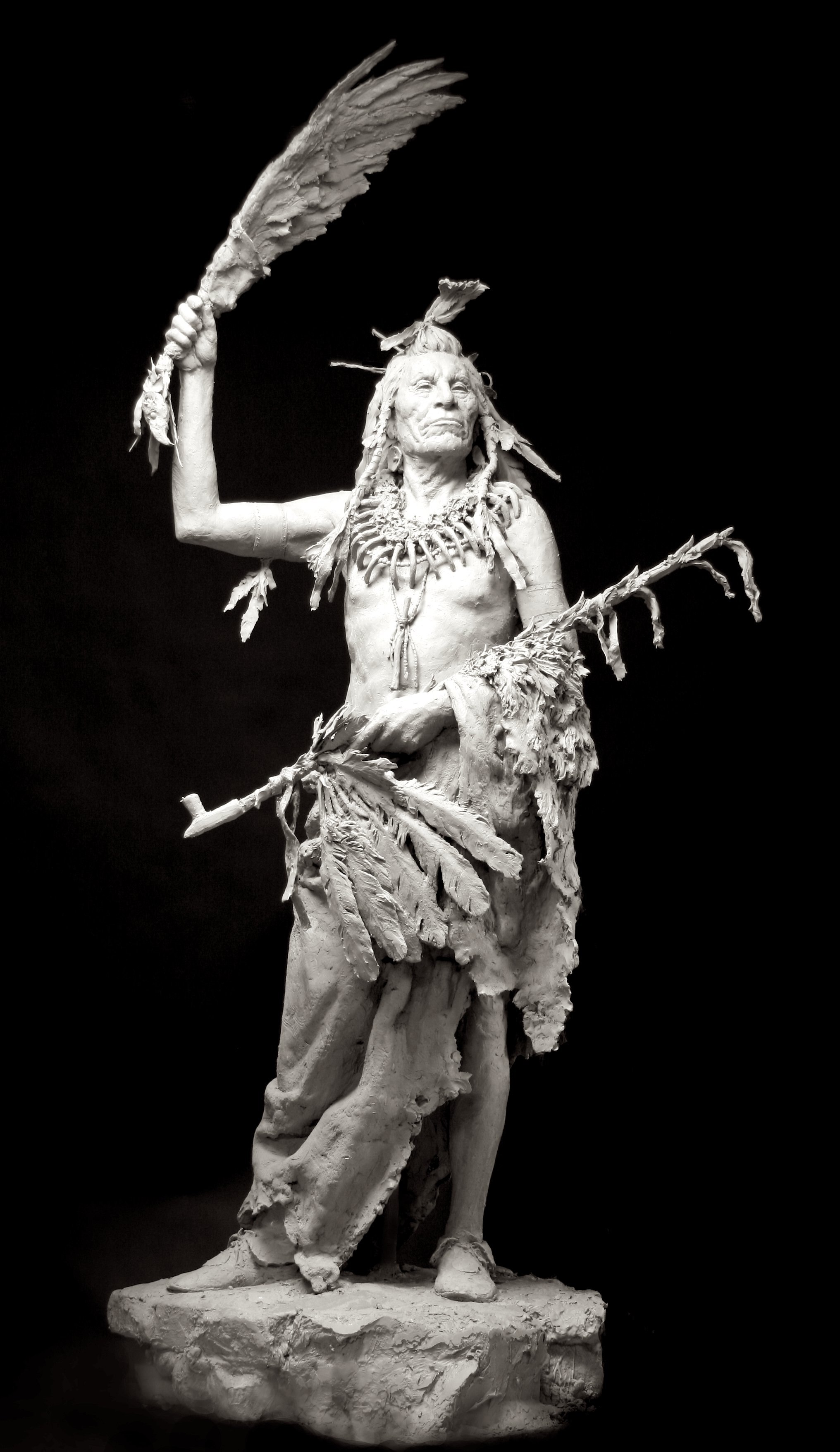 My new sculpture, “The Greeter,” is based on an account by Catlin of the time he spent with Black Moccasin, chief of the Hidatsas. Catlin believed the chief to be 100 years old at that time. Black Moccasin shared with Catlin many of his recollections of his meeting with Lewis and Clark. This sculpture is my interpretation of what Black Moccasin may have looked like at that time; a man in his 70’s standing on the bank of the Missouri River, holding his ceremonial pipe and making a welcoming gesture with his eagle fan.