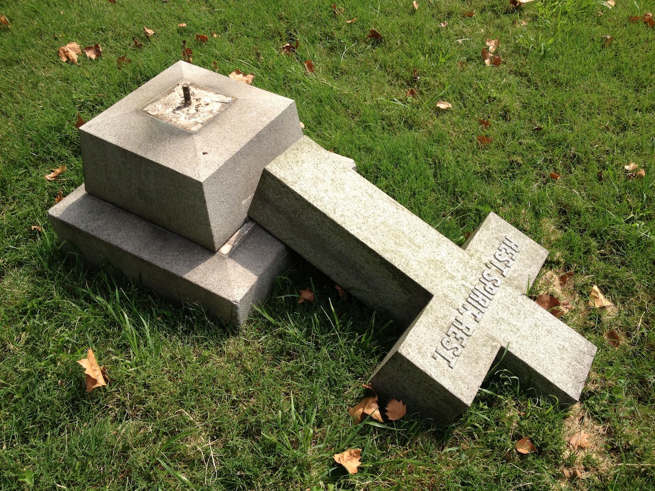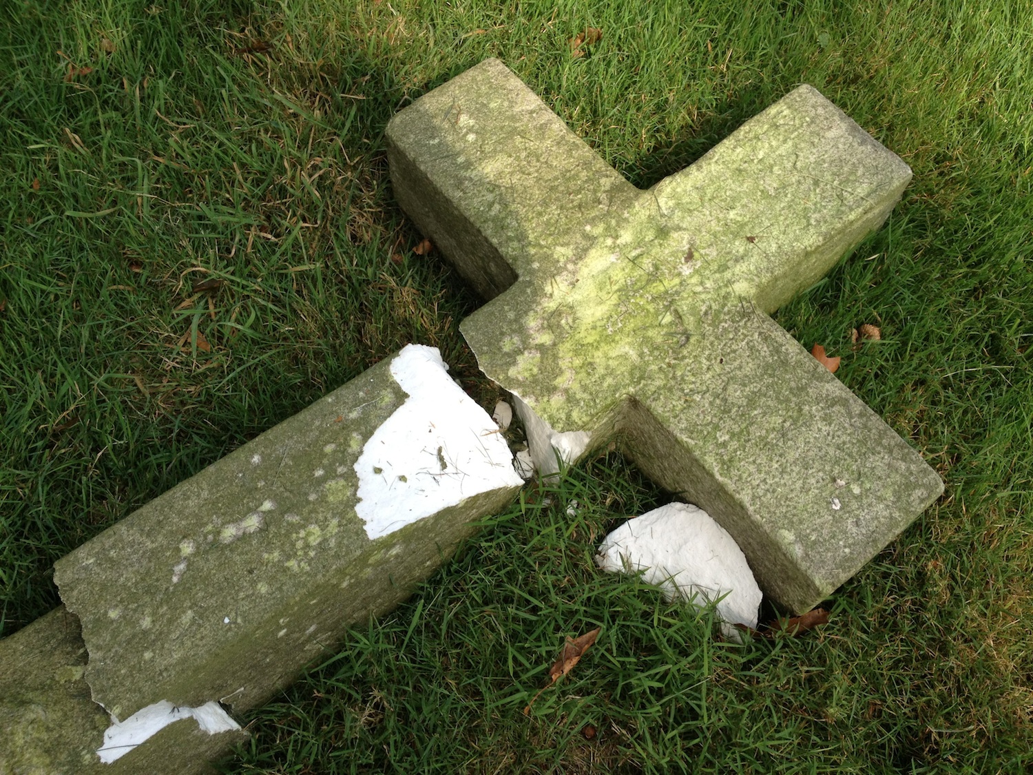The vandal or vandals seem to have targeted crosses. So, this cross, and another right next to it, were smashed into pieces.