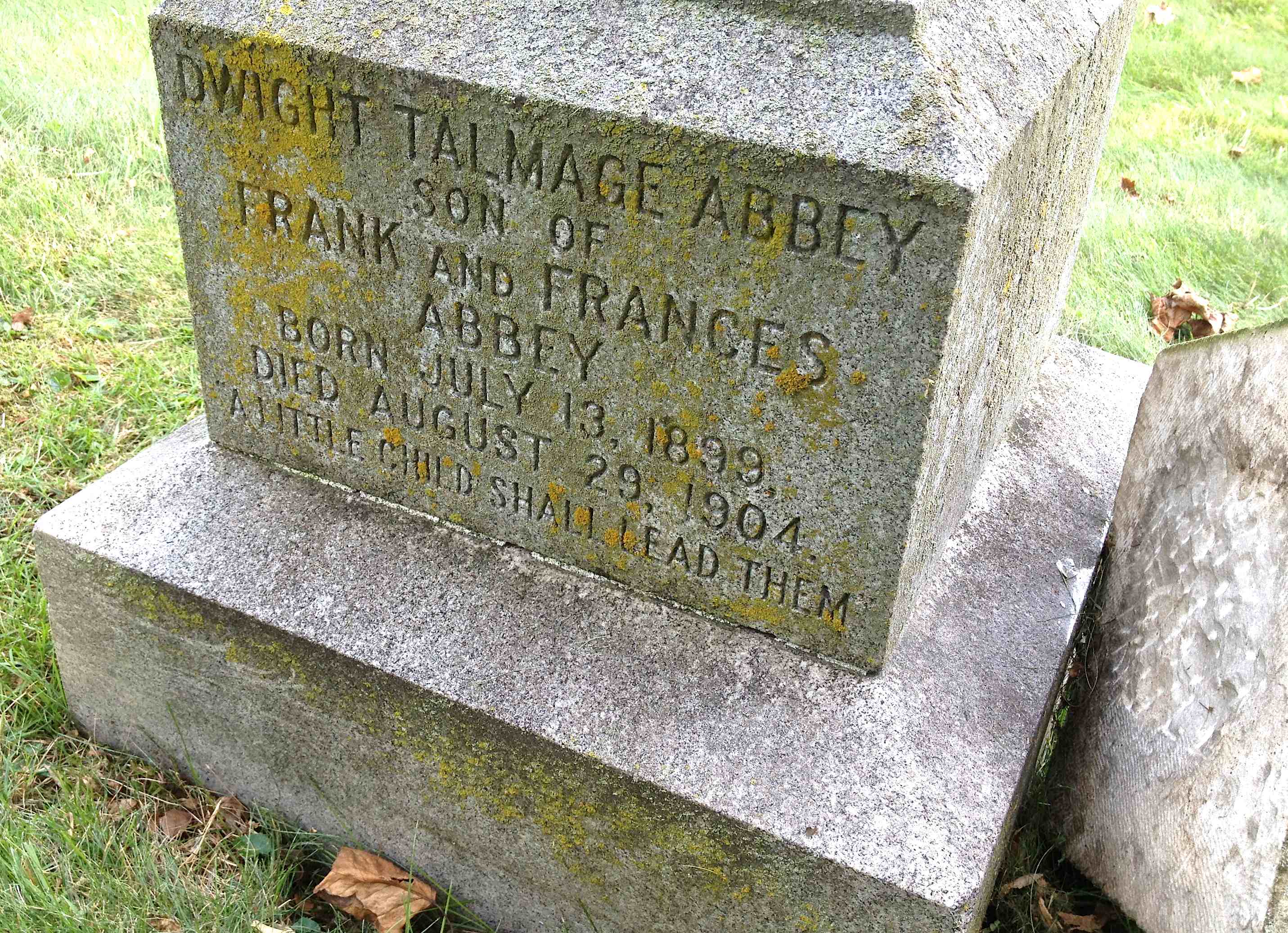 I was out on the grounds Friday morning. The damage is even more aggravating when examined closely. For instance, I knew that an small angel had had its head snapped off after being pushed off its base and crashing to the ground. But, on closer examination, I discovered that that angel was a memorial to Dwight Talmage Abbey, a five-year-old boy who died in 1904. His parents put this monument up as a memorial to their little angel. And now it lies smashed in pieces.