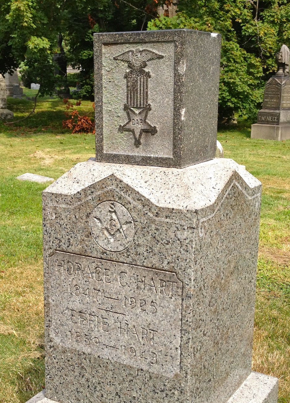 Another monument that was vandalized also struck home with me. It is the monument to Horace Hart, a Civil War veteran. I discovered Horace’s story several years ago; you can find that blog post from 2009 here. Horace served in the 43rd New York Infantry. As a teenager, he fought at Gettysburg, exchanging fire on July 3, 1863 with Confederates. His company was commanded by Captain William Gilfillan, who was killed there that day. When I came out to take a photograph of Captain Gilfillan’s grave for the man I had met who owns the land upon which Gilfillan was shot and died, I spotted Horace Hart’s nearby grave and a symbol on it indicating that he was a Civil War veteran. Researching Horace, I discovered that he had wanted to be interred just feet away from his captain who led him into battle. The vandals knocked the top of his granite monument off–the part that proudly bears his Grand Army of the Republic ribbon–a statement of his loyal service to his country.